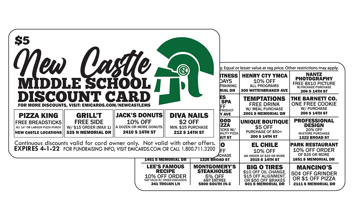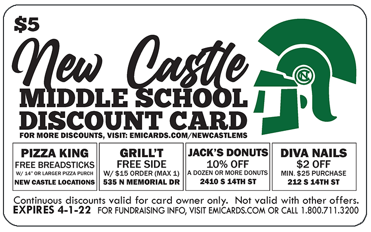 Buy your New Castle Middle School Discount Card here. Save money at great places in New Castle all year long while also supporting your Trojans.